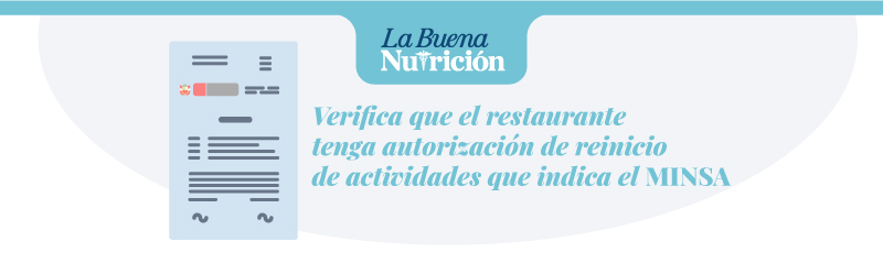 Antes de realizar cualquier pedido, debes verificar que el restaurante donde vas a hacer tu pedido cuente con su autorización de reinicio de actividades lo cual indica que el MINSA ha realizado una inspección sanitaria para garantizar que dicho restaurante cumpla con las normas sanitarias necesarios para realizar dicha actividad. El distanciamiento social es la clave para evitar la propagación de la enfermedad, por eso, esta es una medida que se debe tomar desde los puestos de las cocinas de los restaurantes. En ellos cada empleado debe tener su lugar de trabajo respetando la distancia mínima entre trabajadores.