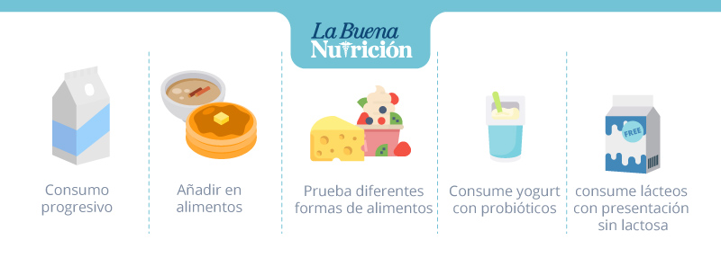 - Consume yogur con probióticos, estos utilizan la lactosa como sustrato, lo fermentan y lo convierten en ácido láctico, de forma que al consumirlo el contenido de lactosa es mínimo y es posible que no genere malestar.