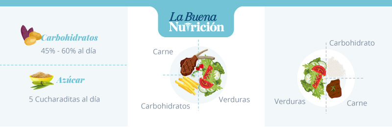 En cuanto al azúcar la OMS recomienda consumir no más  de 5 cucharaditas de azúcar al día. Por otro lado  el MINSA recomienda que los carbohidratos en las comidas principales representen un cuarto del plato de fondo y que se consuman acompañados de medio plato de verduras y una fuente de alimento de  origen animal.