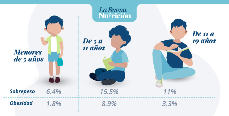 Aunque la población infantil no es el grupo etario que tiene un mayor porcentaje de afectados por el sobrepeso y la obesidad, sus cifras siguen llamando la atención. Según una publicación del Ministerio de Salud (MINSA), dentro del grupo de menores de 5 años, un 6.4% padecen sobrepeso y un 1.8% obesidad; por otro lado, entre los 5 y 9 años, el 15.5% tiene sobrepeso y el 8.9% obesidad. Esta cifra disminuye entre los 11 y 19 años, donde solo el 11% de la población presenta sobrepeso y tan solo el 3.3% obesidad. A su vez, esta tendencia al sobrepeso infantil tiene mayor prevalencia en quienes viven en la ciudad y, en un mayor número, en la población costeña.